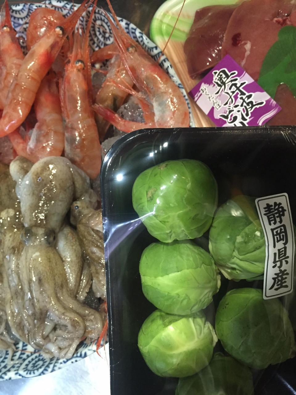 刺身やアヒージョに甘エビ、同じくアヒージョやハンバーグの付け合わせに静岡産芽キャベツ、焼き鳥に奥丹波どりのレバーと砂肝。新物のイイダコは明日には炊き上がるかな〜っと